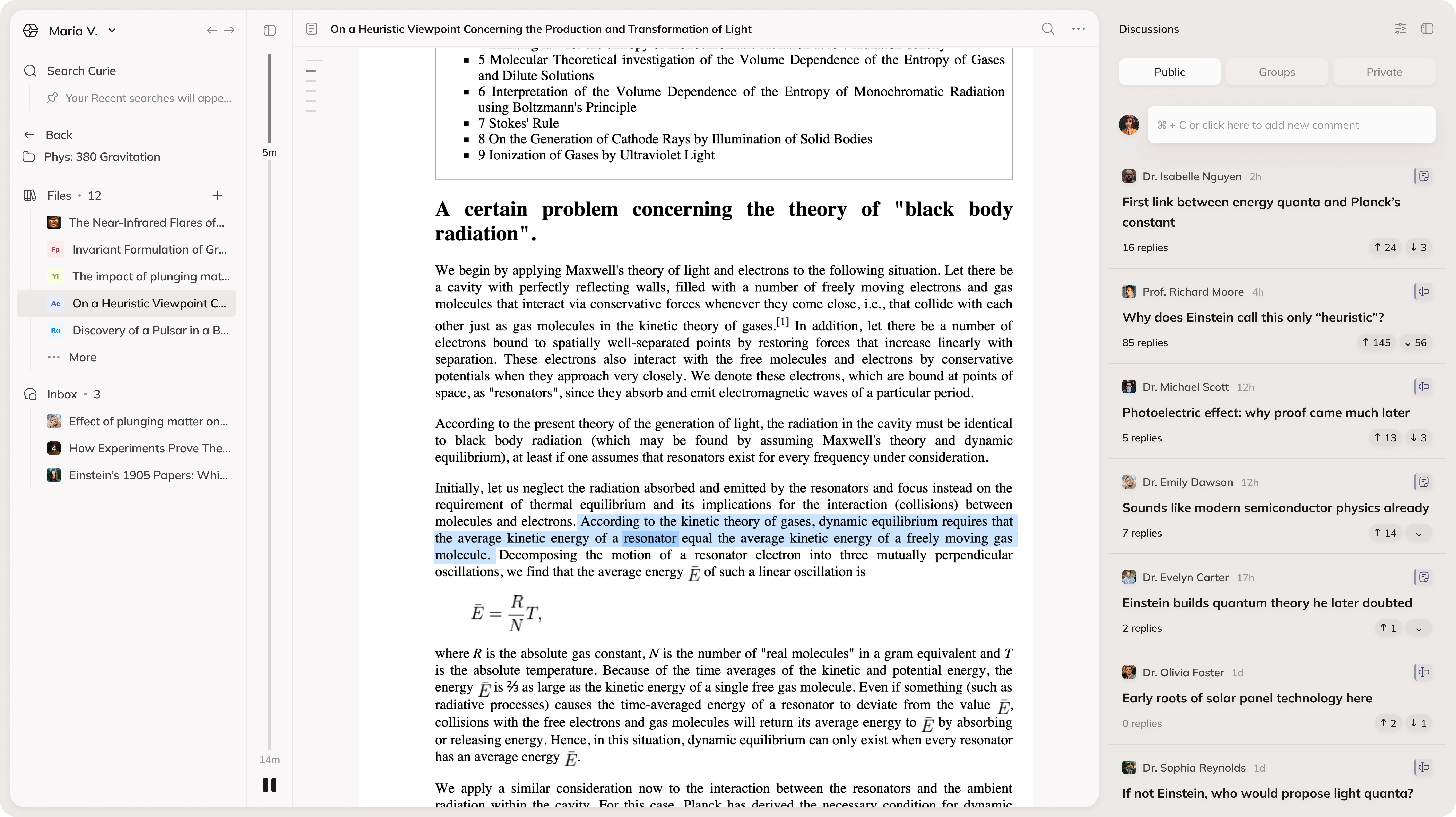 Highlight a passage, start a thread, or open a public discussion around a file. Share insights in groups or keep them private — Curie makes collaboration natural and focused.